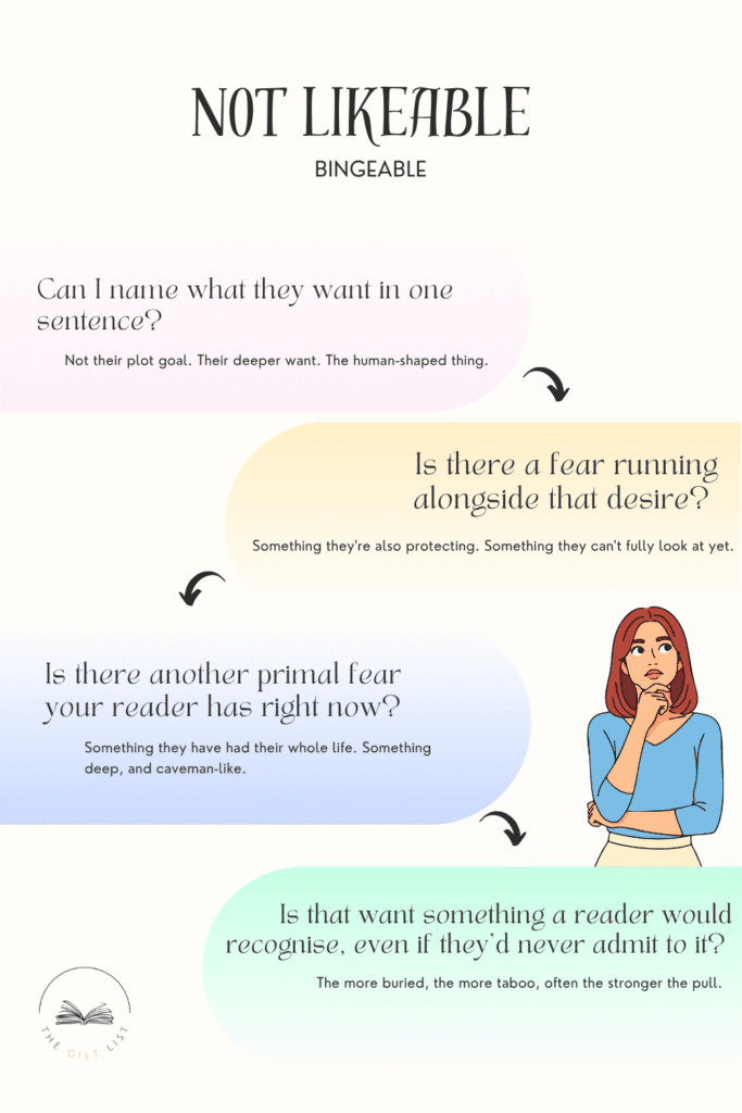 This is one of the first things I look at in a first chapter engagement audit — not whether your MC is likeable, but whether the reader can feel what they want by page three. Whether there’s a buried desire doing any work. Whether the gap is there.